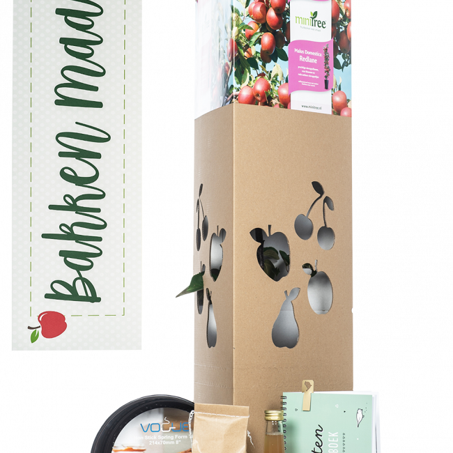 Het ‘Bakken Maar’ themapakket bevat dé ingrediënten voor gezelligheid en genieten. Geniet in het voorjaar en in de zomer samen van de prachtige bloesem en de groei van de appels aan de boom. In het najaar zorgt het pakket voor gezelligheid in de keuken; het samen bakken van een heerlijke appeltaart. De prijs van dit pakket is inclusief verzendkosten.