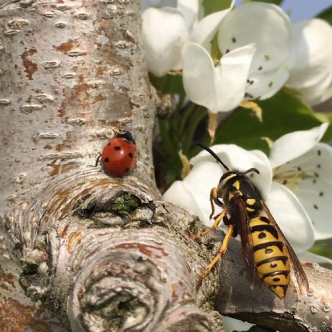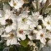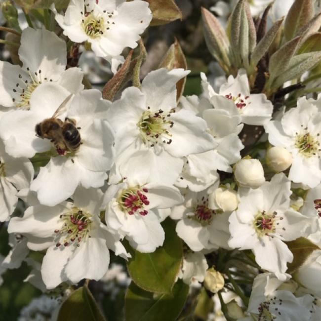 Meerdere perenbomen naast elkaar vormen een mooie fruithaag. Als de fruitbomen op slechts 80 cm afstand van elkaar geplant worden, ontstaat een schitterende ‘muur’ van bloesem in het voorjaar en fruit in het najaar.