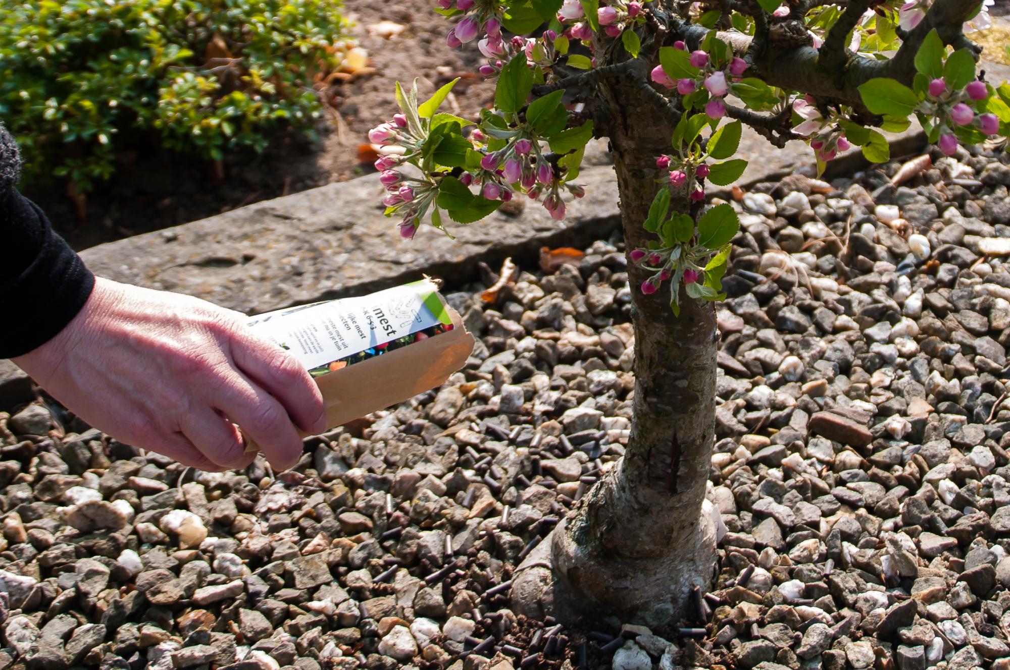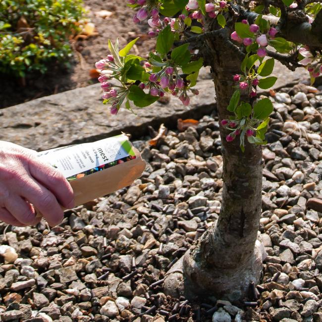 • MiniMest; deze organische insectenmest stimuleert de groei van de appels aan de boom en kan het beste 2 keer per jaar (april en juli) worden toegediend.